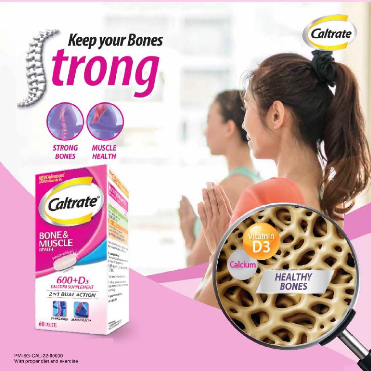 Caltrate® Bone & Muscle Health contains 600mg of Elemental Calcium for bone health and 500IU Vitamin D3 for good muscle health.