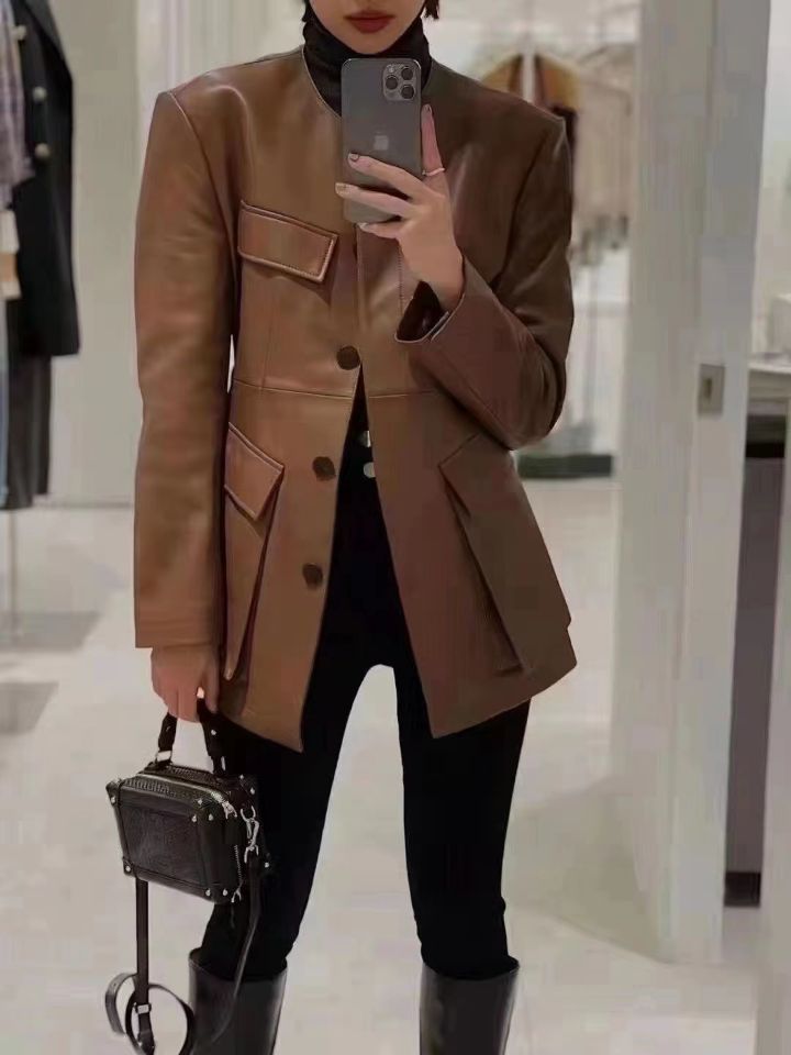 Spring 22 Ladies Real Sheepskin Leather Shirt Long Sleeve Black Bomber Jacket Genuine Leather Jacket With Irregular Pockets