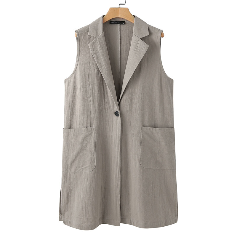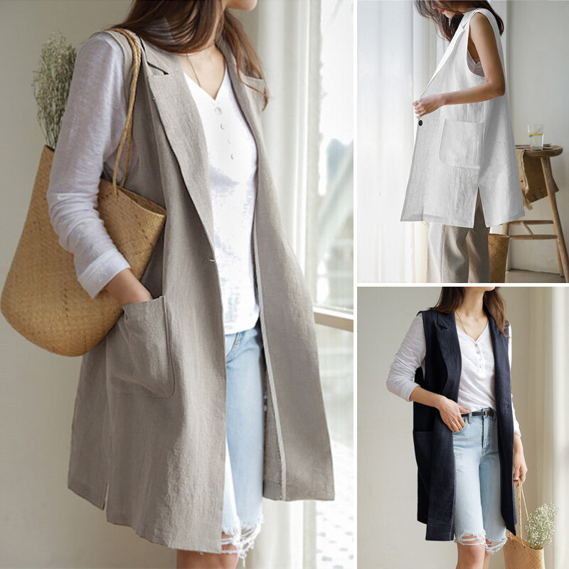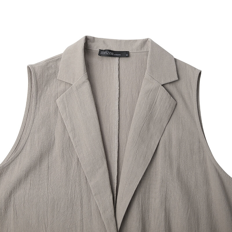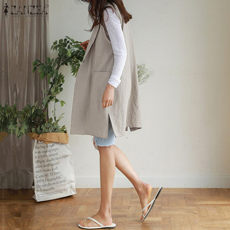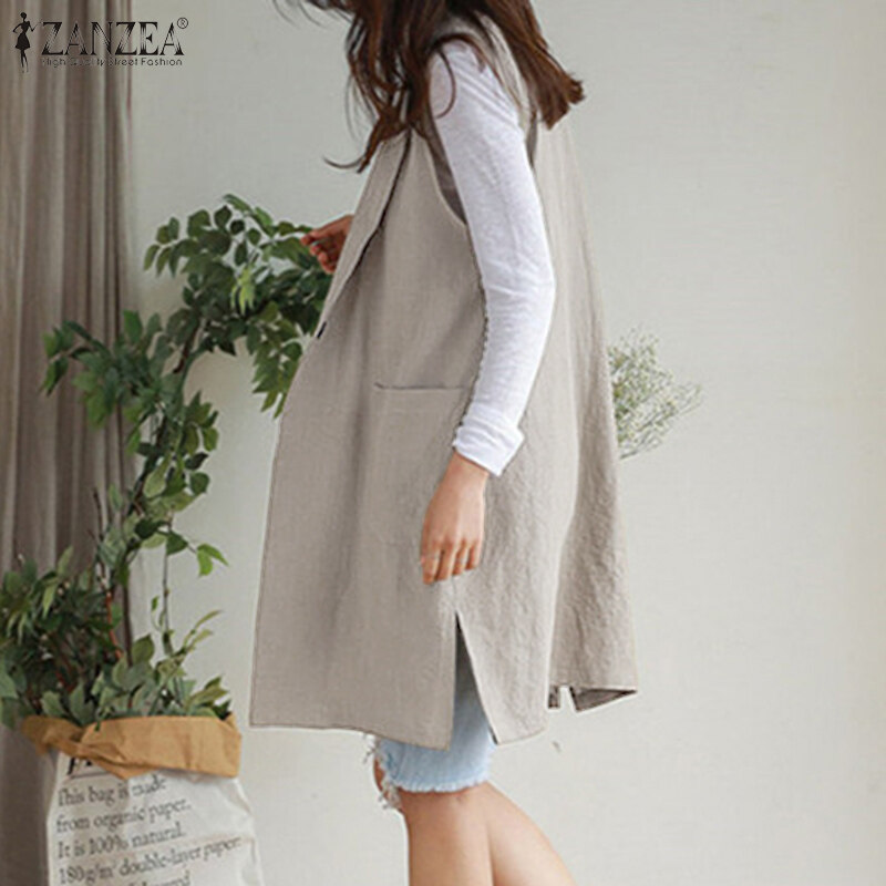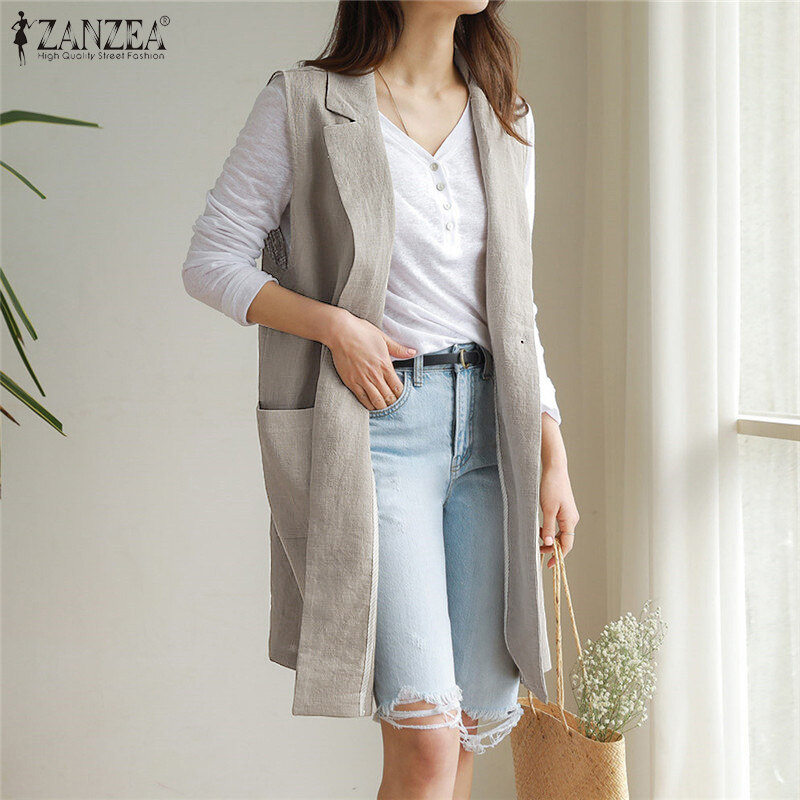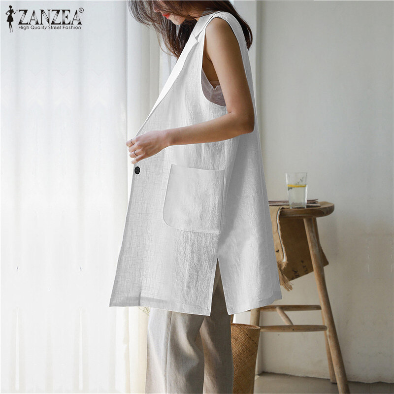 ZANZEA Women Sleeveless Pure Cotton Blazer Suits Plain Basic Button Casual Waistcoat
