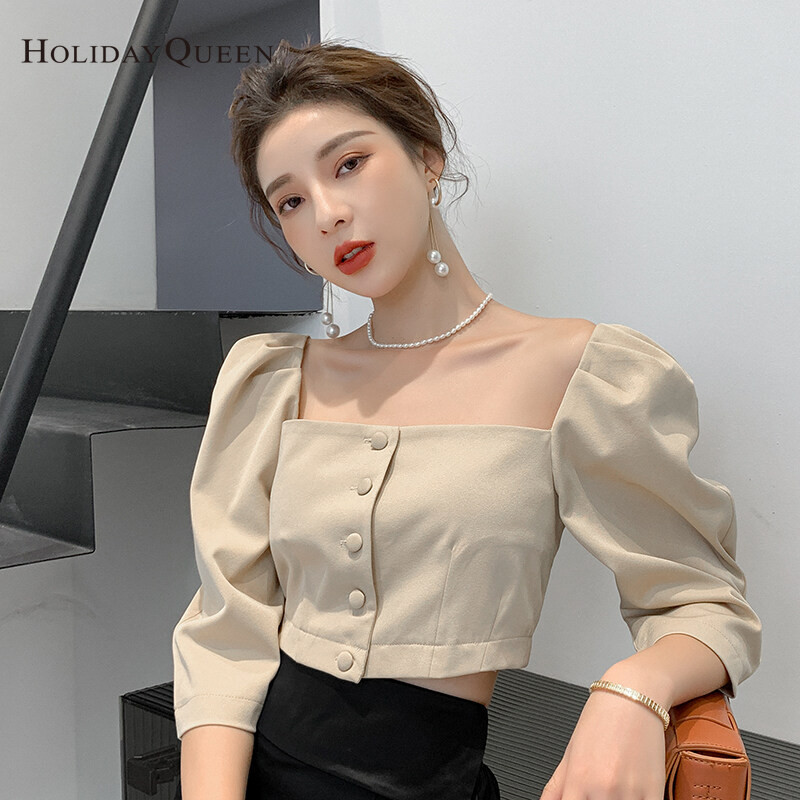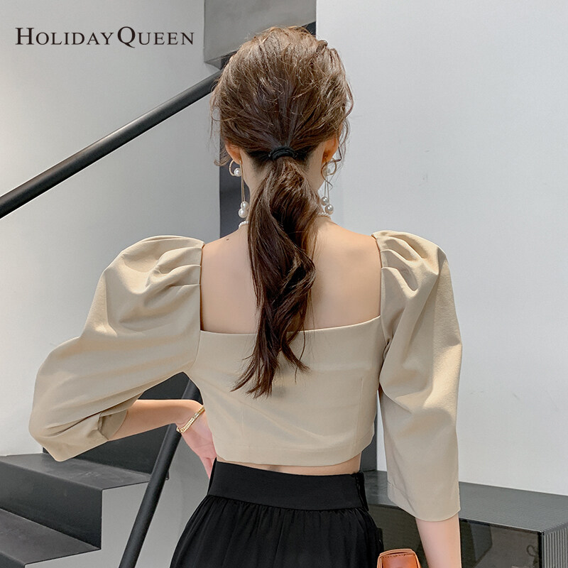 HolidayQueen Autumn Women's New Style Short Square Neck Puff Sleeve French Design Khaki Shirt S M L XL Free Shipping HQ0524