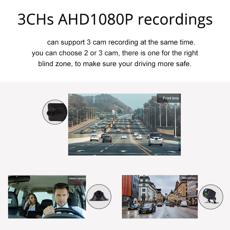• Three-way camera: 1080 front, 1080 rear, 1080 right view or in car