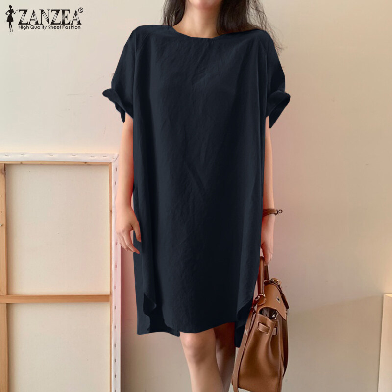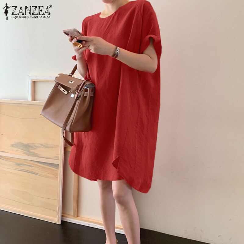 ZANZEA Korean Style Women Short Sleeve O-Neck Linen Cotton Plain Mini T-Shirt Dress