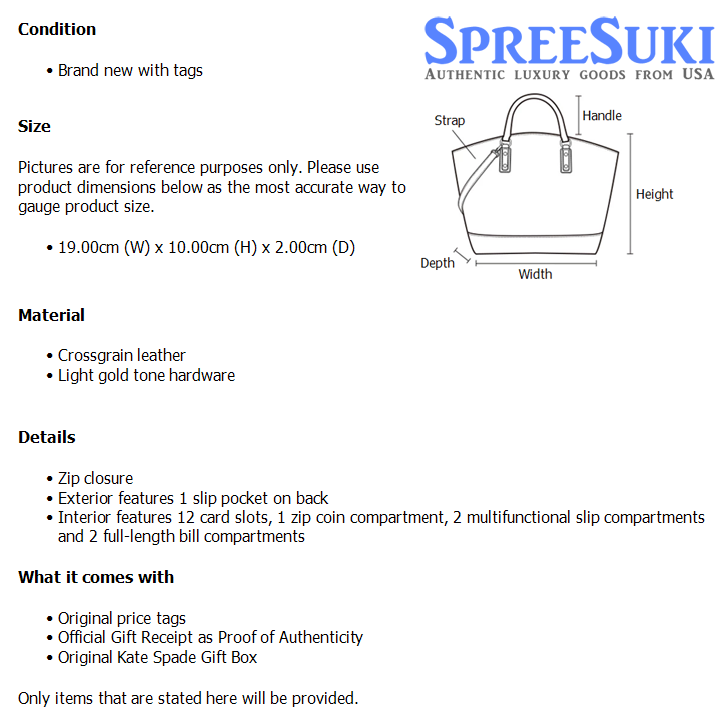 All our products are 100% authentic and purchased from Kate Spade stores in USA. We are a reputable registered business in Singapore and it is illegal to sell counterfeit goods in Singapore. This product also comes with a gift receipt which is printed by the Kate Spade store that we purchased the item from. It states the item that we purchased and the Kate Spade store that it was purchased from, proving the authenticity of the item. Buy with confidence.