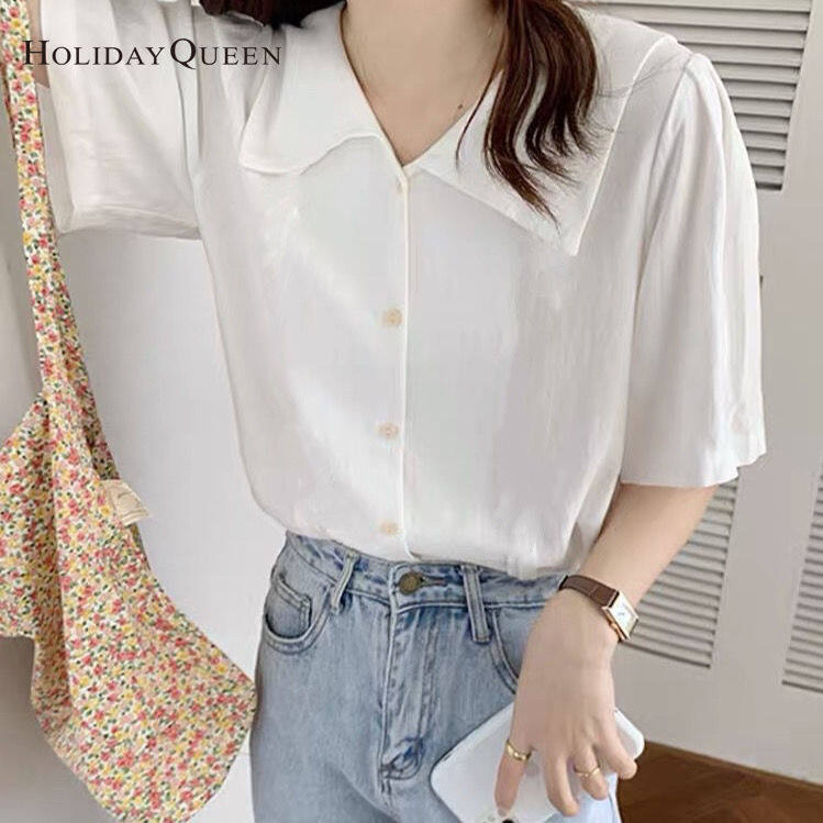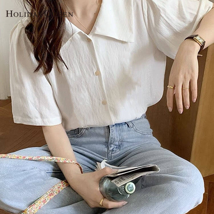 HolidayQueen White Shirt Women's Short-sleeved Design Niche Shirt New Retro Hong Kong Style French V-neck Temperament Top HQP0902