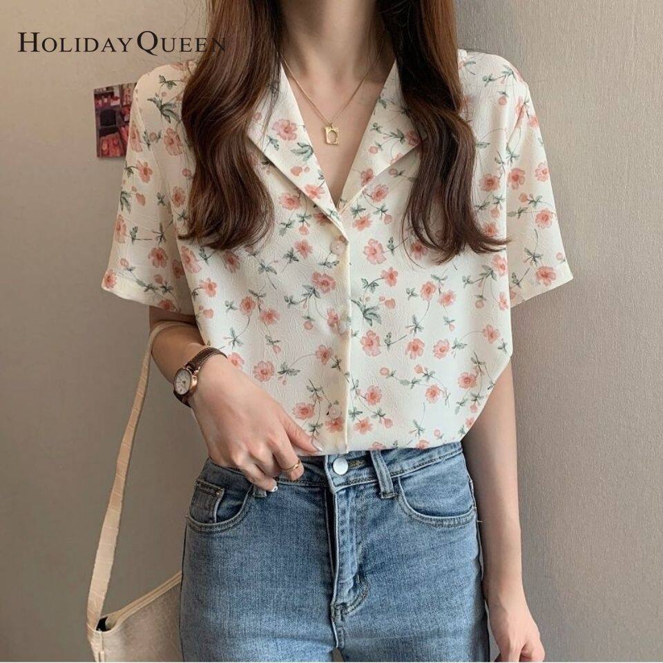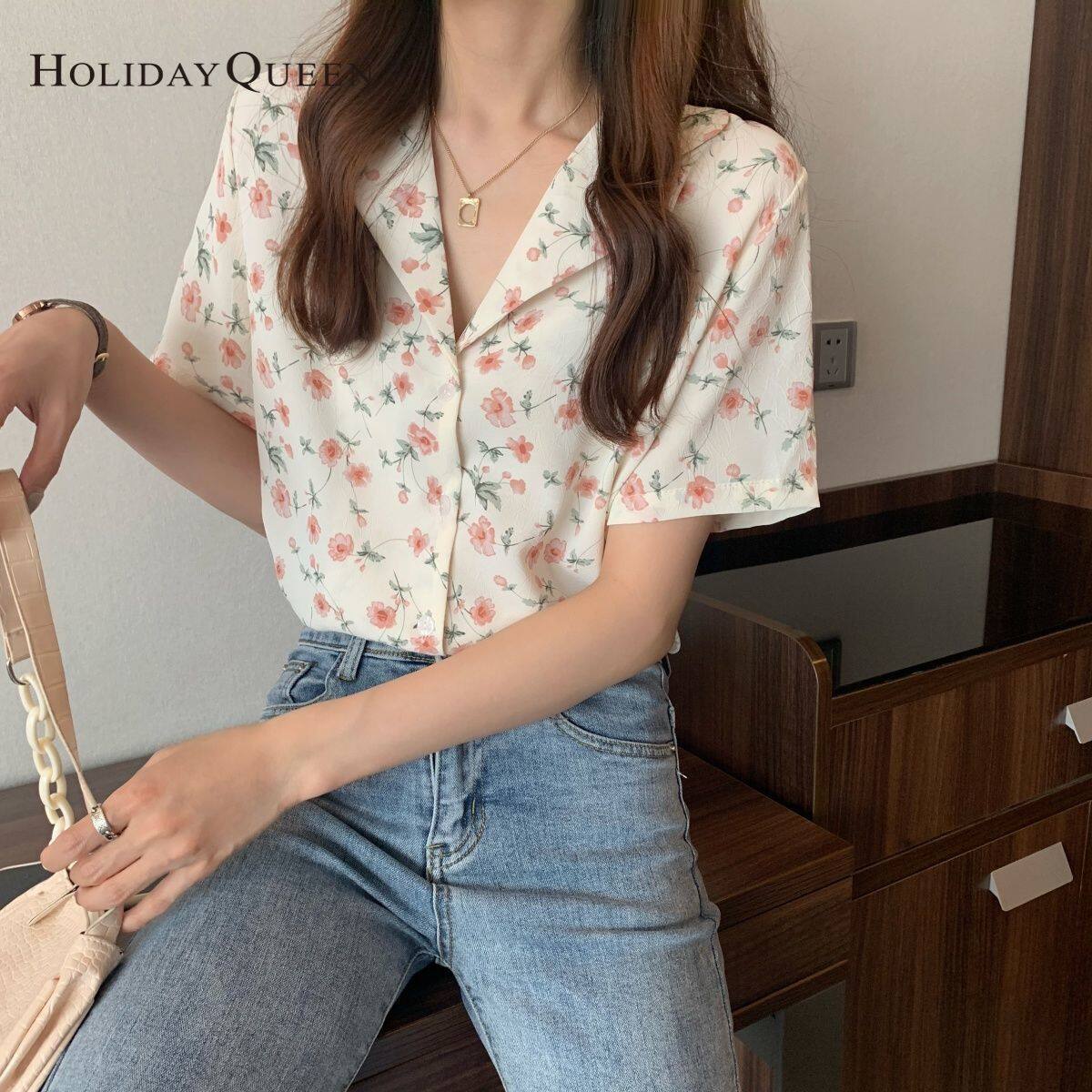 HolidayQueen Top Women's New Loose Small Fresh Floral Shirt Retro Wild Shirt Short-sleeved Design Niche HQP0900