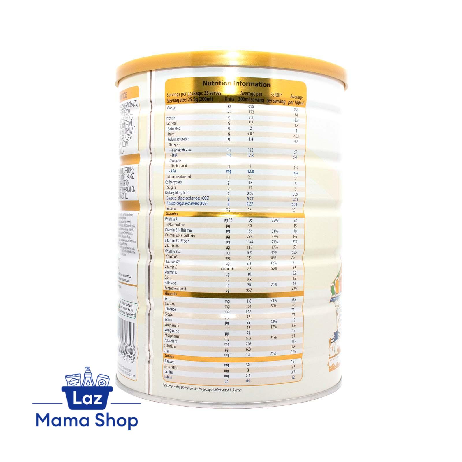 Contains Skim milk solids, Lactose, Vegetable oil blend, Whey protein concentrate, Demineralised whey powder, Galacto-oligosaccharides, Fructo-oligosaccharides, Emulsifier, ARA, DHA, Choline Chloride, Taurine, L-carnitine, Lutein, Minerals and Vitamins. Contains Dairy, Soy and Fish.