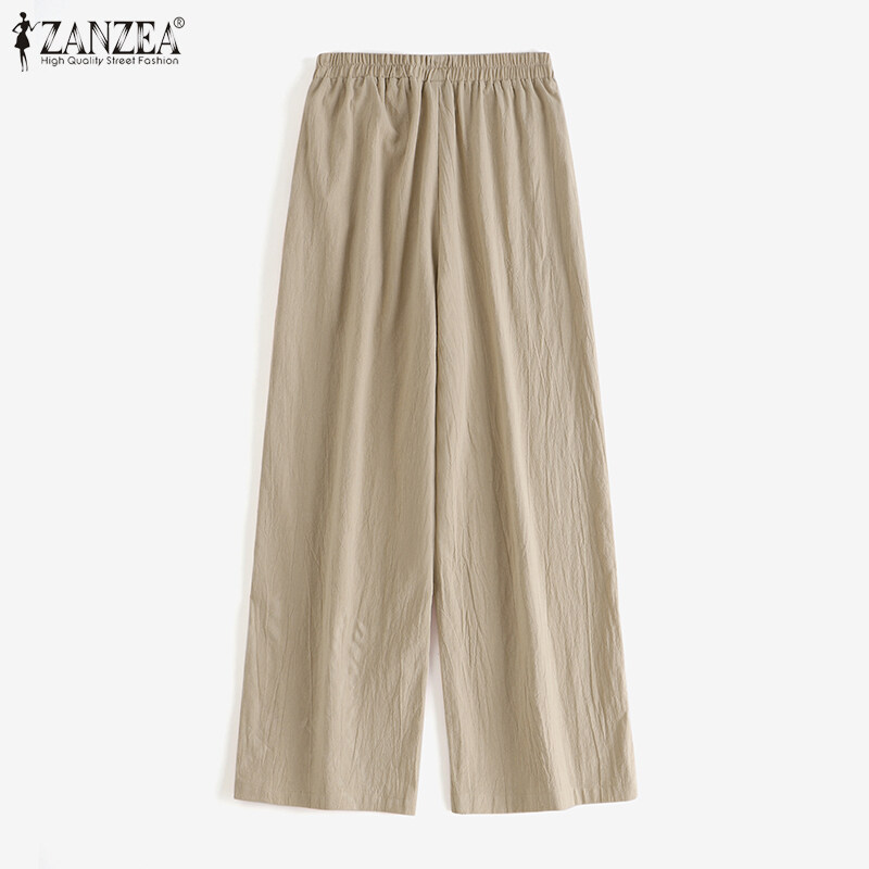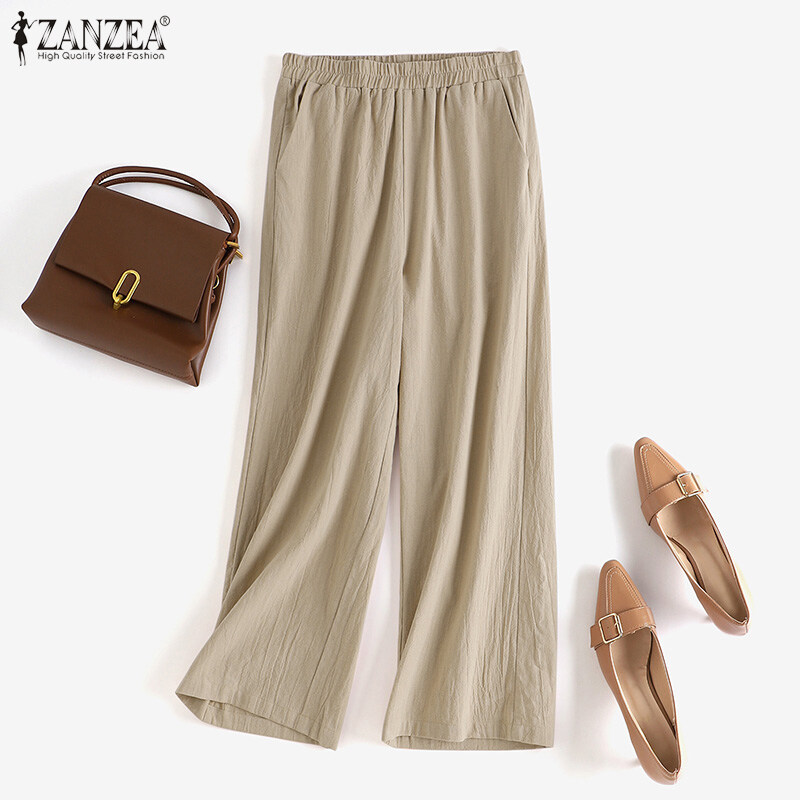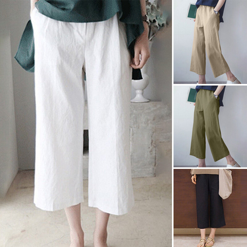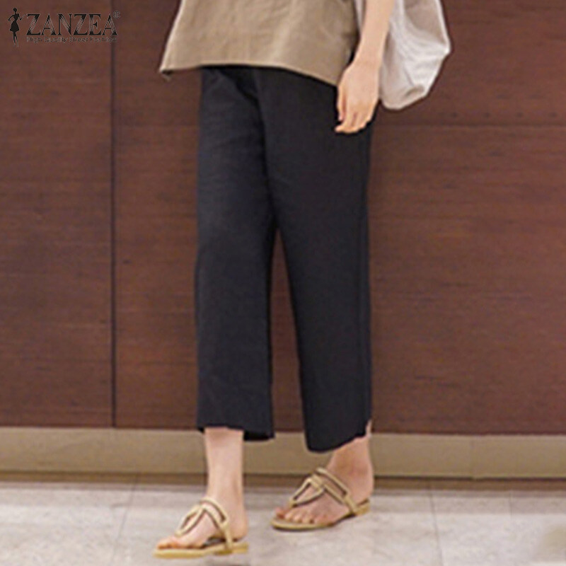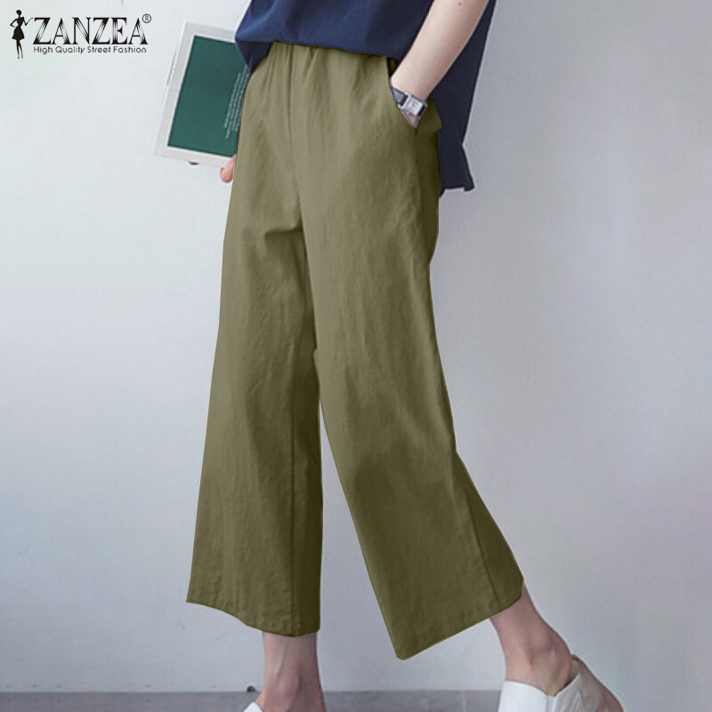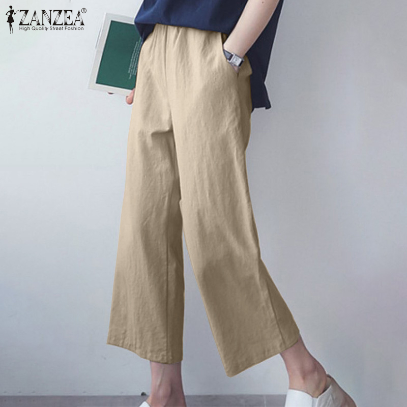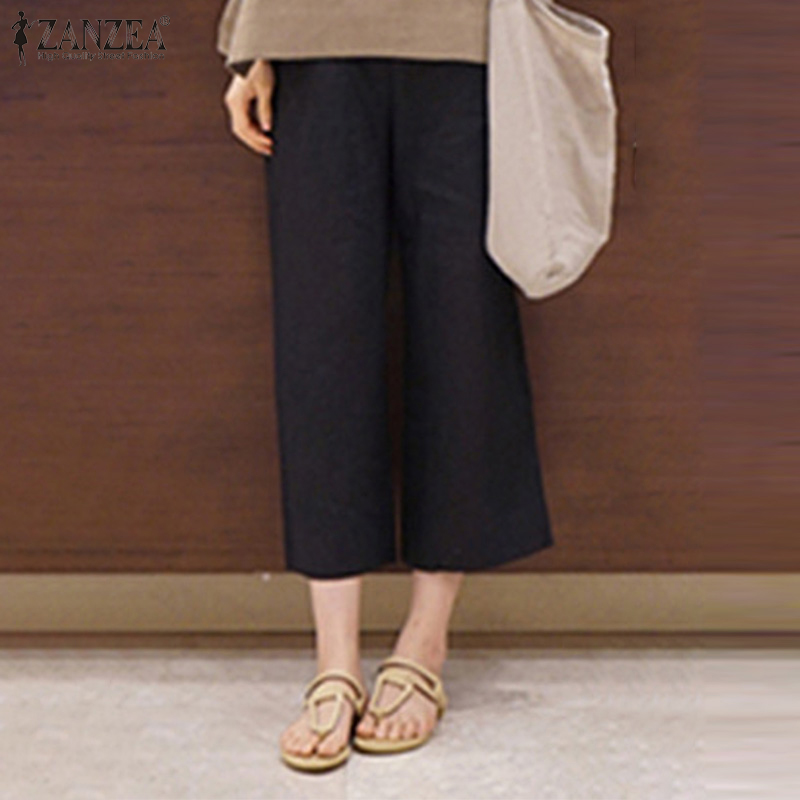 ZANZEA Womens Summer Cotton Loose Cropped Pants Elastic Waist Solid Trousers Slacks