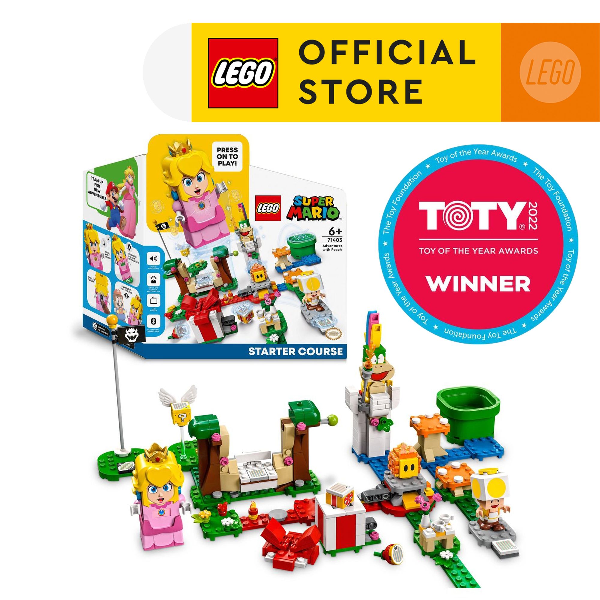 Add gift-giving fun and more digital-coin-collecting play to kids’ LEGO® Super Mario™ collections with this Adventures with Peach Starter Course, featuring an interactive LEGO® Peach™ figure.