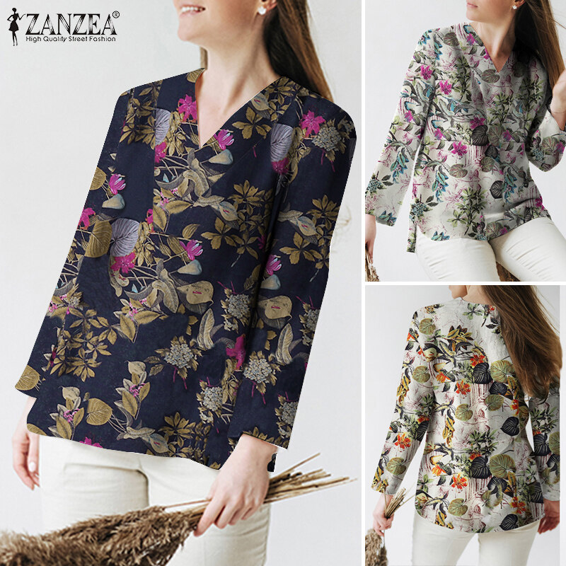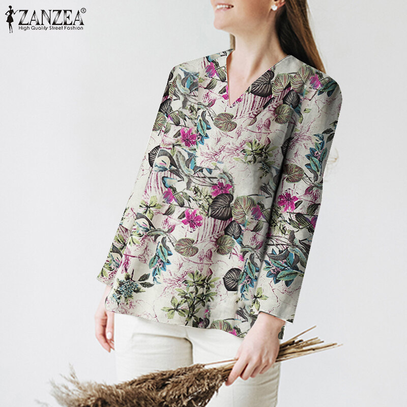 ZANZEA Womens Long Sleeve V Neck T Shirt Splid Hem Casual Holiday Cotton Linen Blouse #12