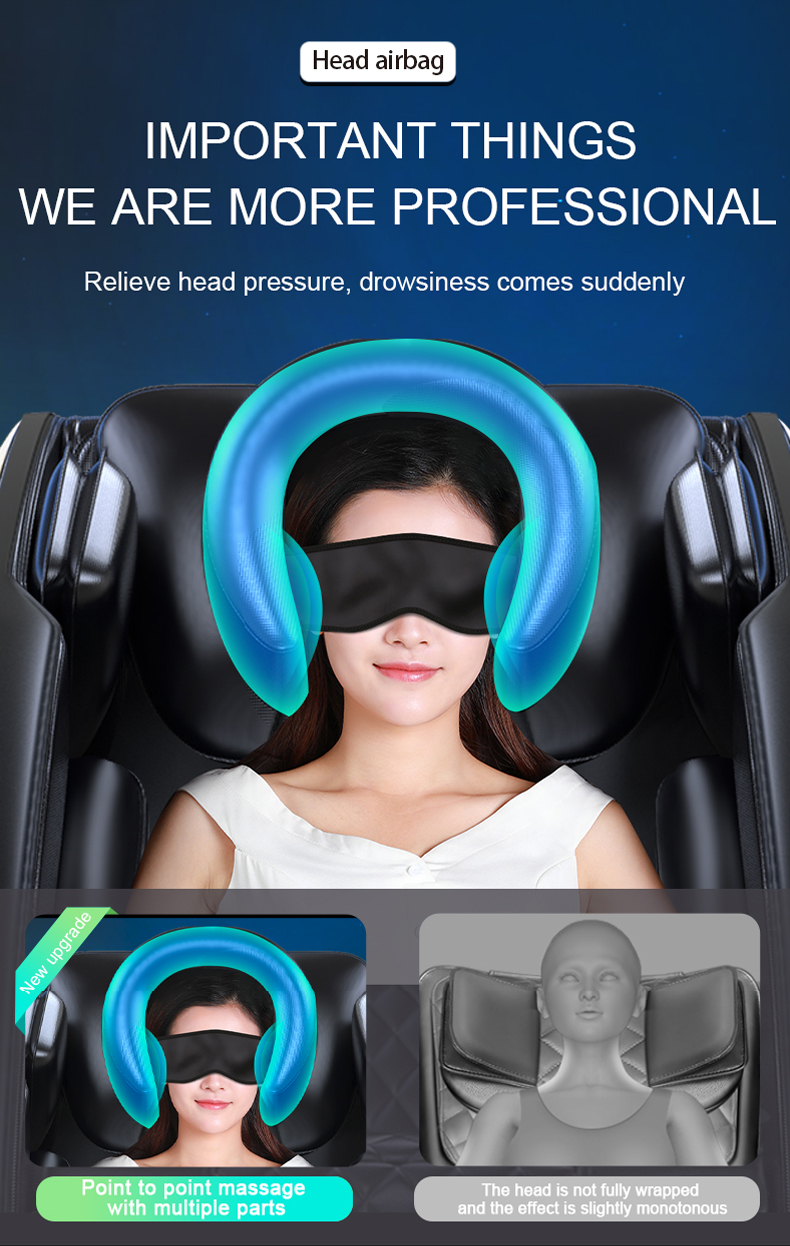 * U-shaped headrest package * Sleep mask | Thigh embracing Leggings * Zero gravity levitation | SL track layout * Full body air bag embracing | Legs stretch freely * Hip roller massage | Foot roller * Timing design | HIFI Bluetooth music * Customlzed automatic mode * A variety of human simulation techniques * Multil gear adjustment | One click forward * All in one installation free * Save electricity and reduce consumption