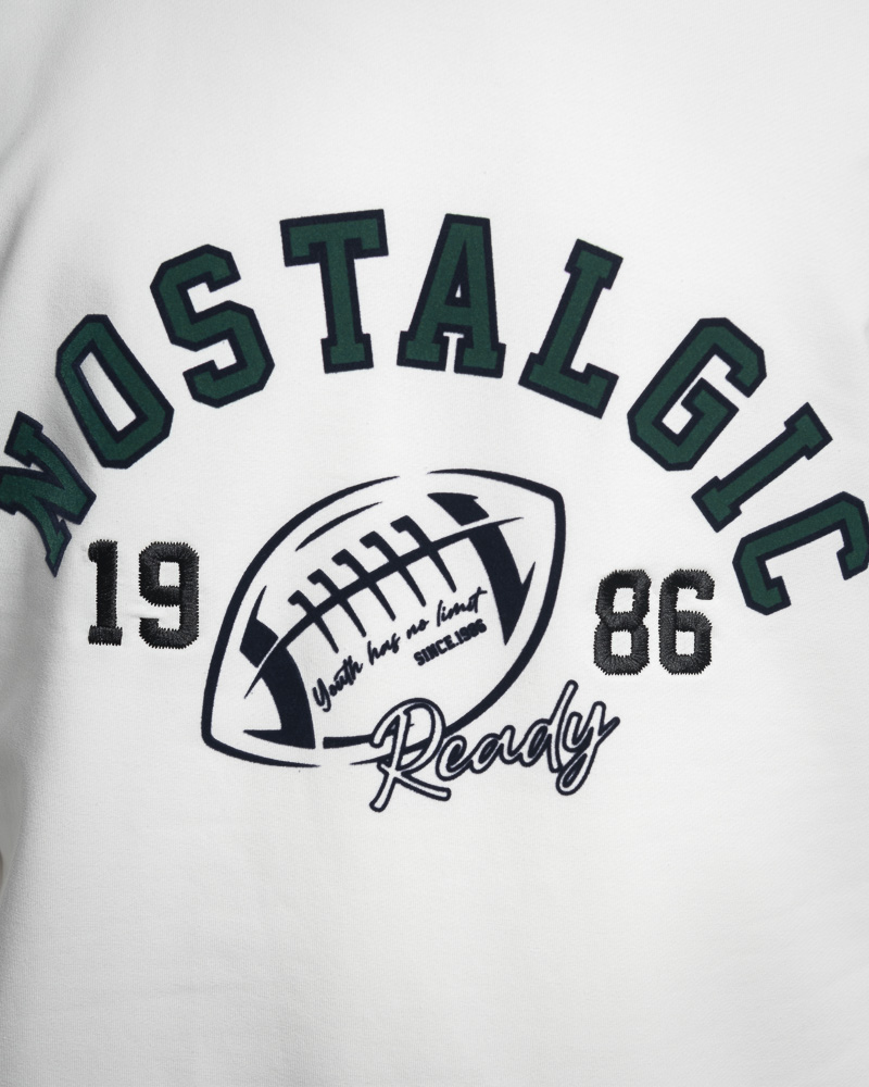 Regular Solid Coloured Long Sleeve Sweatshirt with Round Neck. Comes with NOSTALGIC Slogan and Rugby Ball Outline Graphic at the front. Made of cotton.