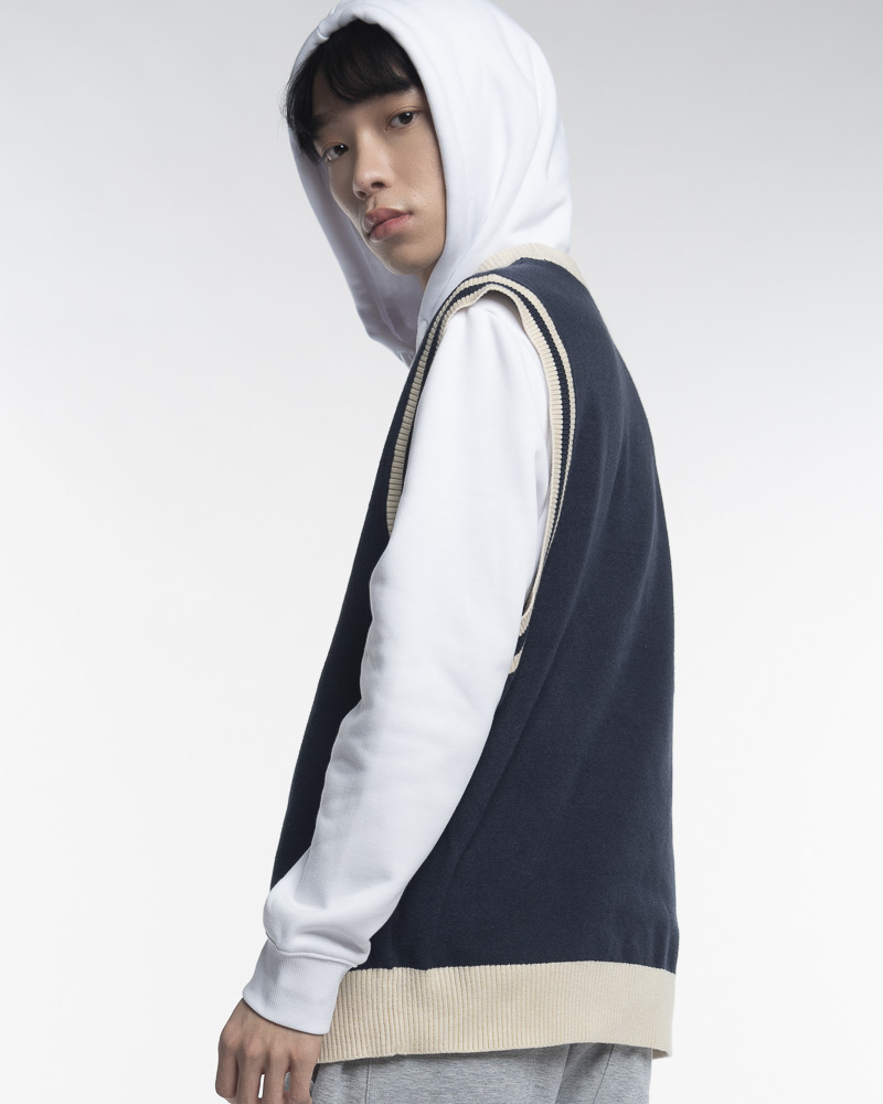 Yishion Men Knitted Round Neck Varsity Vest With Asymmetrical Contrast Coloured Neckline and CREATIVE Slogan (Dk. Blue)