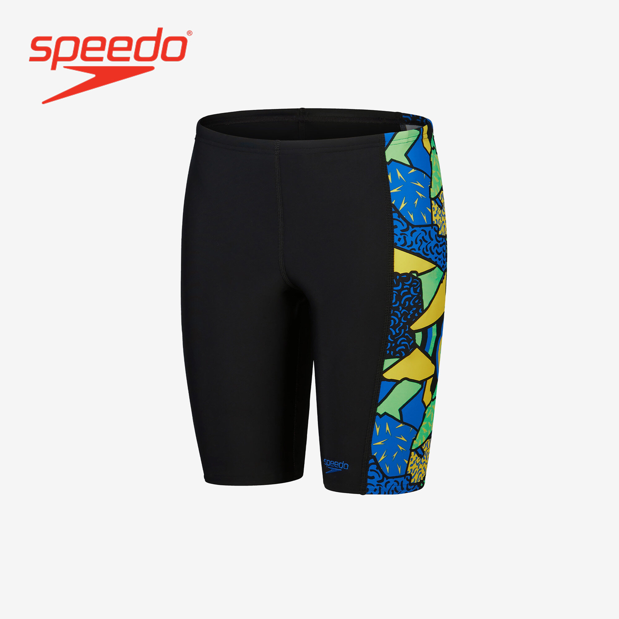 Style and comfort for lessons and training. Ooze confidence wearing this sleek black Jammer, which features side panels of our high-energy abstract print in bright yellow, green and blue. Lined at the front for comfort and modesty, the jammer includes an internal drawcord to allow your child to achieve a secure and comfortable fit. Providing higher chlorine resistance than standard swimwear fabrics, it offers excellent shape retention and fits like new for longer with CREORA® HighClo. If you’re looking for great eco-credentials, it’s got those, too: our exclusive Eco EnduraFlex fabric is made from 100% recycled pre-consumer waste, such as fabric waste from factories.