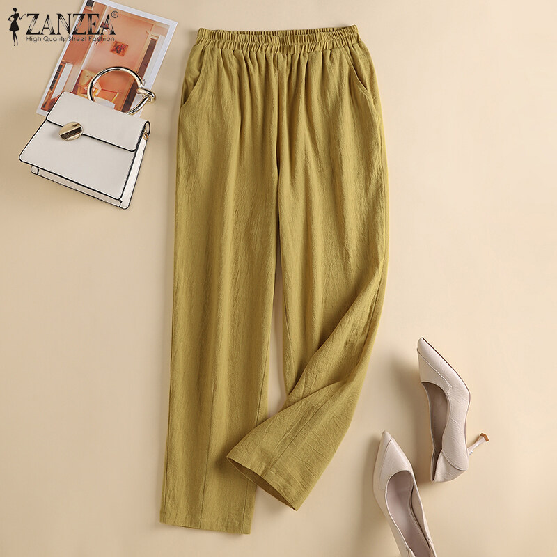 ZANZEA Women Leisure Simple Skinny Solid Pants Vintage Cotton Elastic Waist Trousers #8