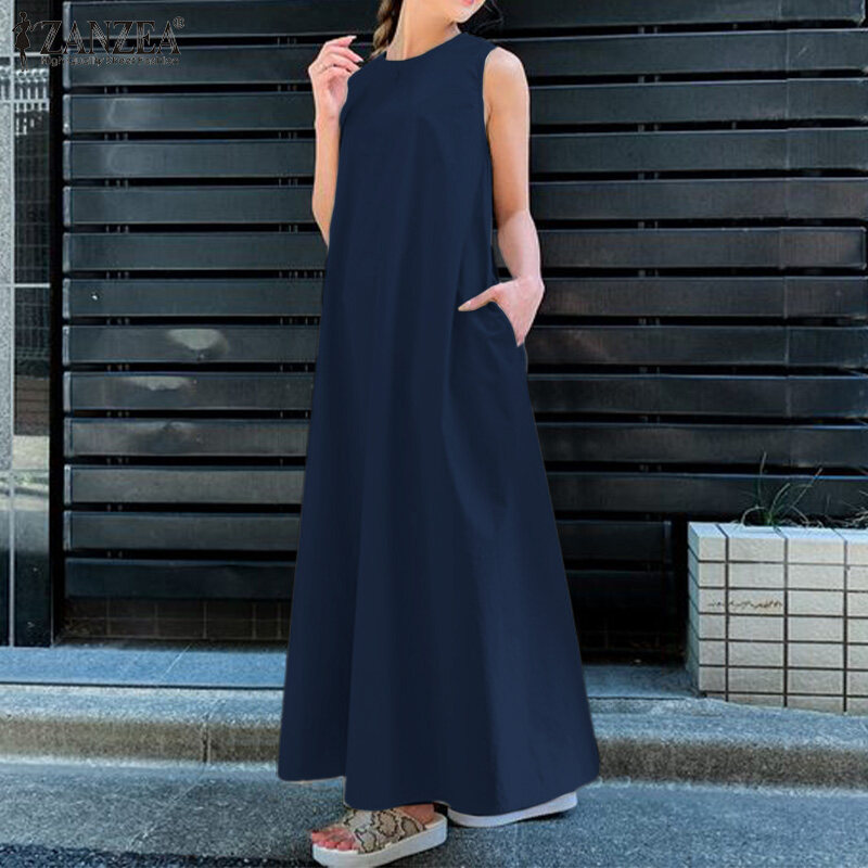 ZANZEA Korean Style Women's Dresses Vintage Sleeveless A-Line Loose O-Neck Maxi Tank Sundress #8