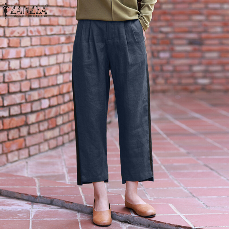 ZANZEA Women Vintage Causal Cotton Linen Irregular Trousers Back Elastic Waist Harem Loose Pants #8