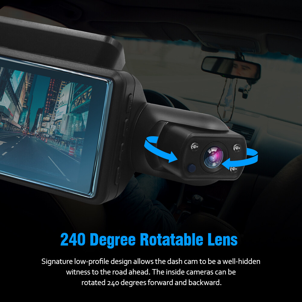 Signature low-profile design allows the dashcam to be a well-hidden witness to the road ahead, the inside cameras can be rotated 240degrees forward and backward