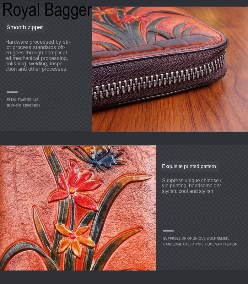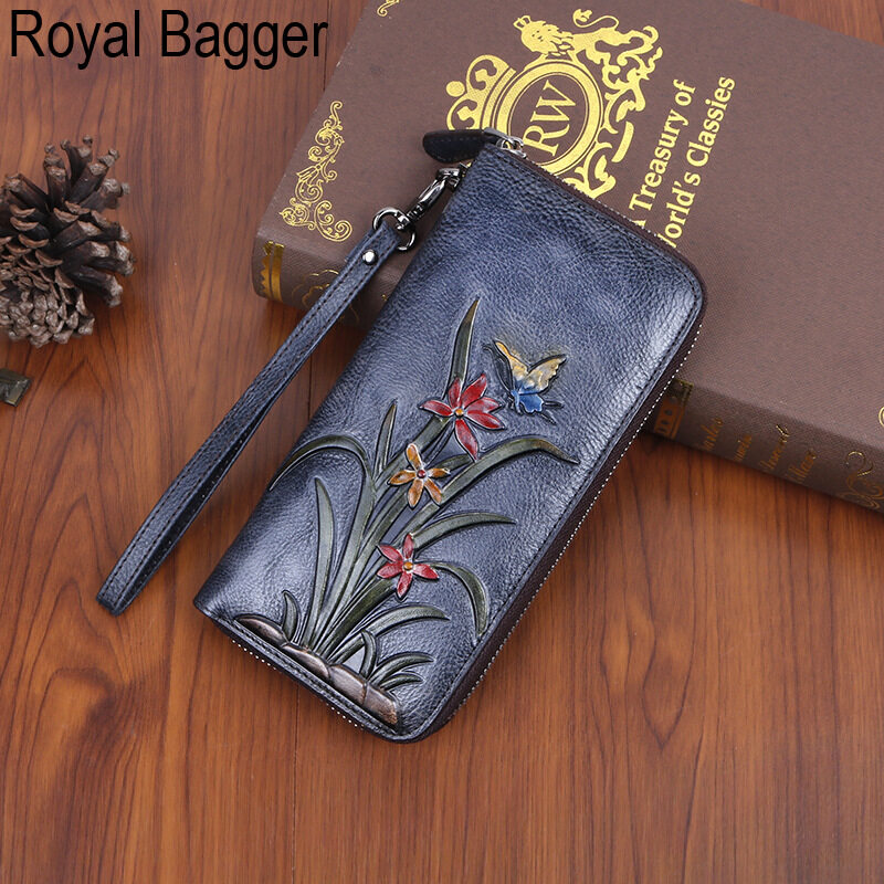 Royal Bagger Genuine Cow Leather New Fashion Women Girls Long Wallet Purse Super Hot High Capacity Retro Flower Clutch Bag Handbag Women's Multifunction Bags Casual Multi-Card Position Wallets
